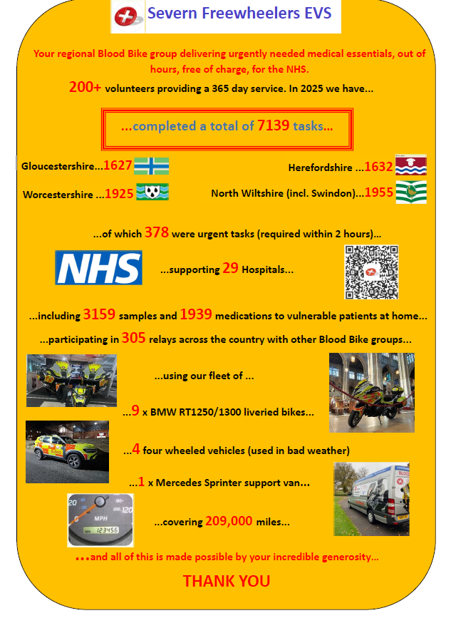 Of this total,1632 jobs were completed by the Herefordshire team using a combination of blood bikes (including Fred) and 4×4 vehicles. The team were very grateful that the new 4×4 vehicle, Elgar, became operational in time for the first of the Winter storms and it seems to have been in almost constant use ever since making deliveries and keeping our volunteers safe as they worked through the storms, snow and floods.